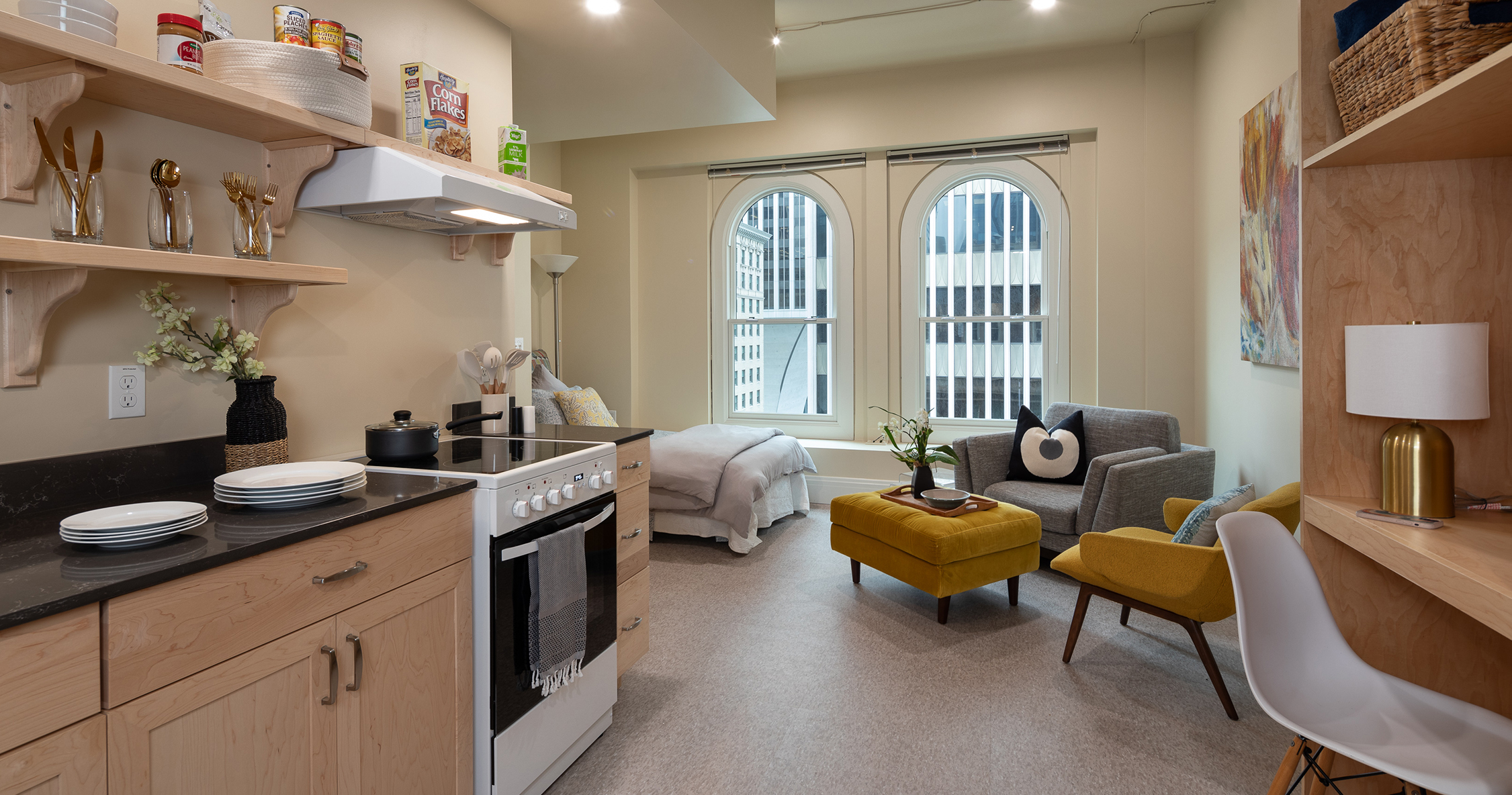 The YWCA Fifth and Seneca project converted six floors of a historic 1914 building into 114 studio and one-bedroom apartments for formerly homeless individuals, balancing historic preservation requirements with modern upgrades.